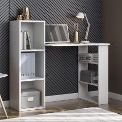 Компактный компьютерный стол «СТК 1» со столешницей размером 822*493 мм. С одной стороны столешница опирается на открытый стеллаж размером 150*734*460 мм с двумя полками. С другой стороны столешница пристыковывается к открытому пеналу размером 328*1026*296 мм также с двумя полками.